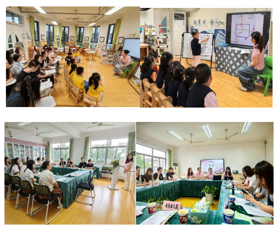 大 1 班倪玮玮执教数学活动《大阅兵》,大 2 班钱晨怡执教科学活动《地铁出行攻略》,马施施老师户外游戏案例交流《基于“大阅兵“集体活动生发的户外建构游戏探究——以“我来造坦克”为例》,教学办主任卢丽萍老师则围绕 “生成性主题集体活动的设计与实施”带领三位老师进行了一次微教研。她明确教师在活动前需 “洞察儿童、感受儿童、挖掘资源、量体裁衣设计”,活动中需 “唤醒经验、发现需求、拓展方法、链接应用”,并达成 “幼儿为本、兴趣为始、生活为源、发展为重、教法为活、扩展为生” 的共识。最后青浦佳佳学前教育集团的各家姐妹园的教师代表纷纷对两次集体活动做出了中肯的点评,大家的建议朴实又具有可操性,为两位青年教师后续的优化与改进打开了新思路。